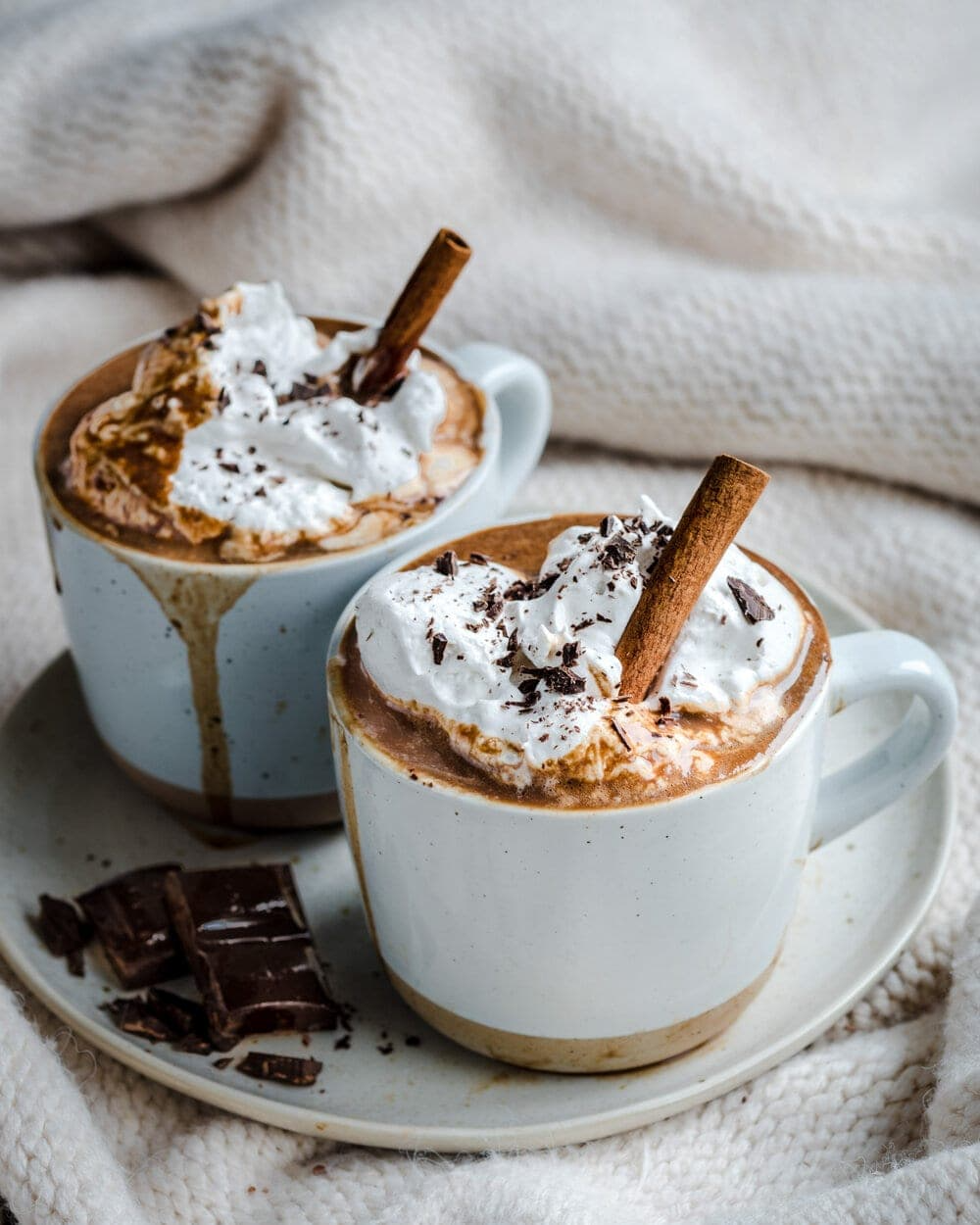 This gingerbread vegan hot chocolate (Rainbow Plant Life) is about as wintery a drink as you could get! Top with vegan whipped cream, and a cinnamon stick.